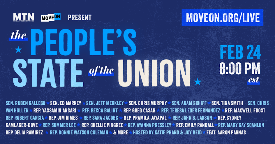 Join MeidasTouch and MoveOn as we present the People’s State of the Union alongside elected officials, partners, allies and directly impacted Americans.