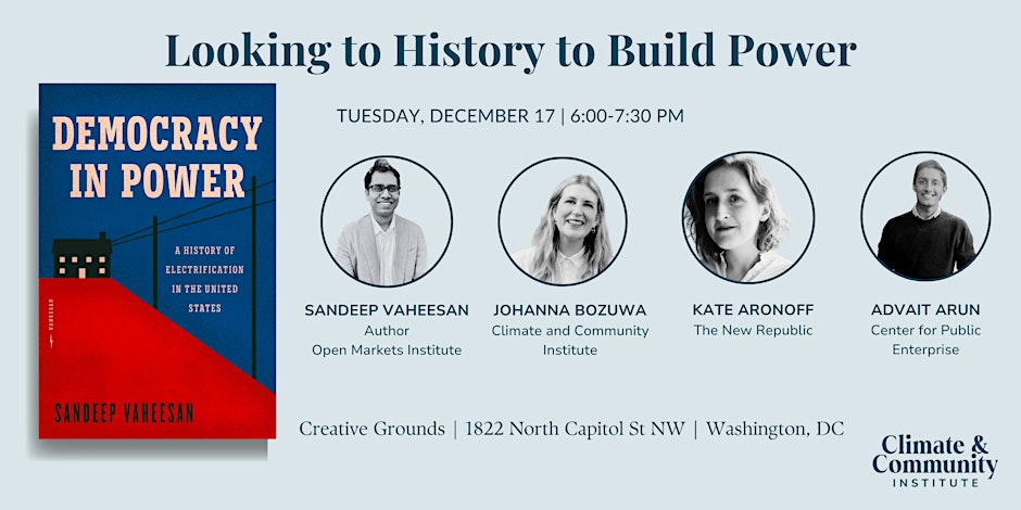 In his debut book, Democracy in Power, Sandeep Vaheesan brings in the past to equip campaigns of the future. Vaheesan traces the rise of publicly governed utilities in the twentieth-century electrification of America, exploring its backers and headwinds. There is no doubt that controlling and democratizing the grid is a story of David vs Goliath– but it is a fight we have won in the past.